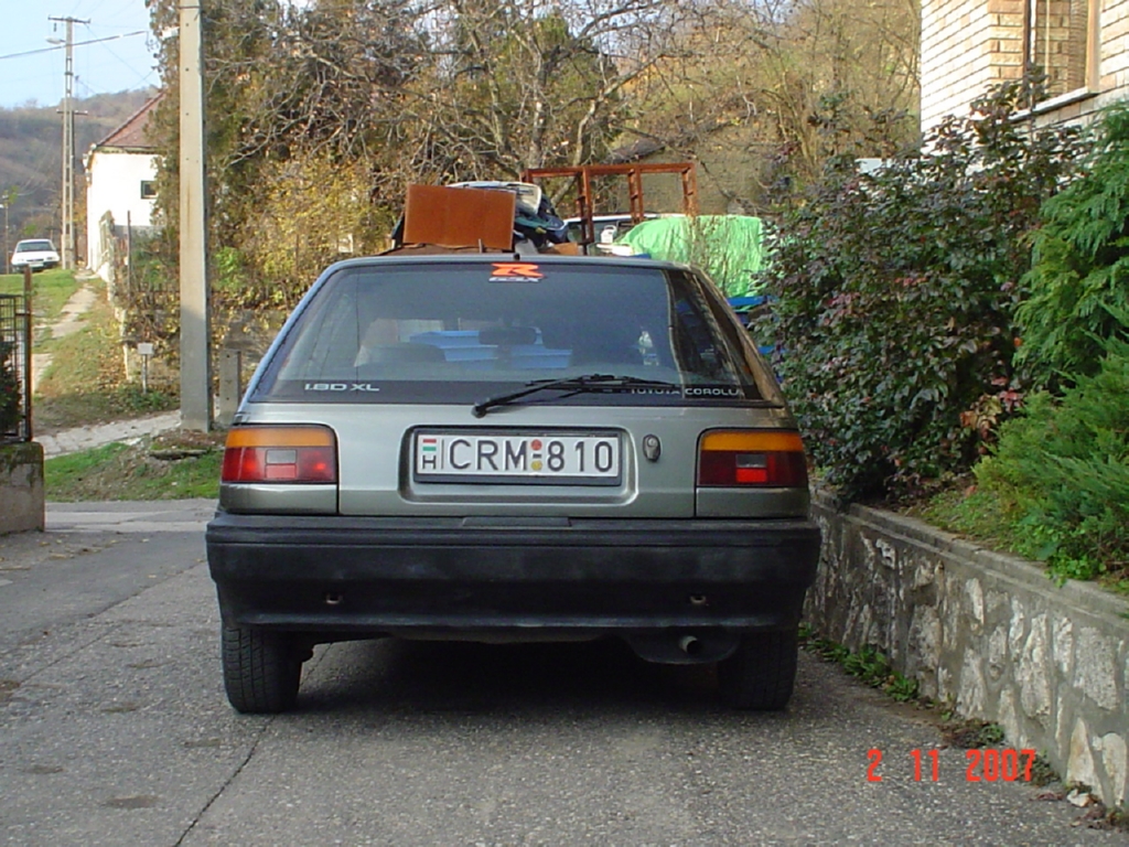 | Pár szó magamról, fejlesztések, emlékek, jó sztorik...: | 1995-ben sérülten vettem egy 85-ös évjáratú kombit,persze 1,8D-t, megjavitottam és jó pár évig használtam.Aztán egy rokonnak eladtam(nem tom ,hogy tehettem). De aztán pár éve visszatértem a helyes útra és bevásároltam rendessen.A környékünket erőteljessen fertőzőm.Csak is Toyotát,ha lehet corollát és a "régebbit" | ||||||||